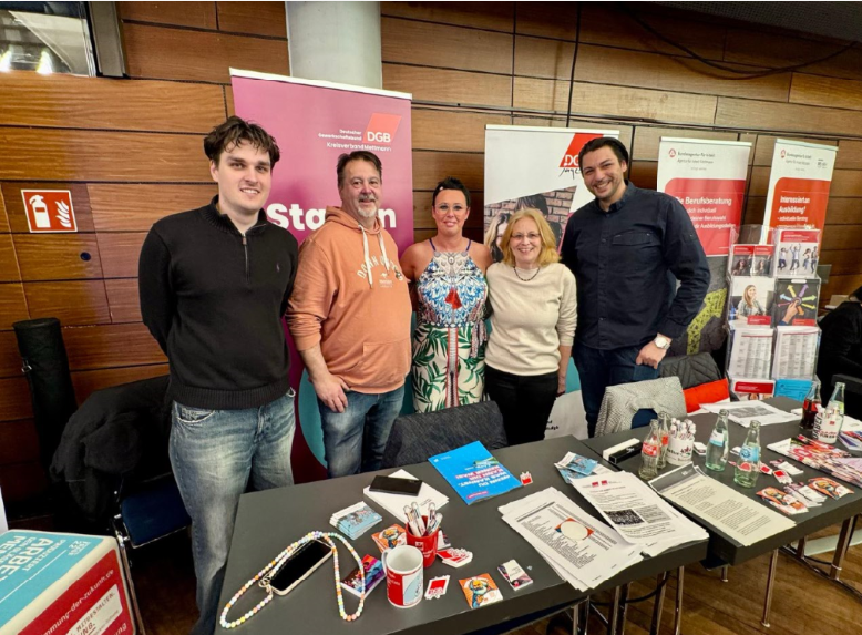 Bunt, vielfältig in der Ansprache und informativ präsentierten sich auf der Ratinger Ausbildungs- und Studienmesse viele Unternehmen, Verbände und Berater*innen den Schülerinnen und Schülern. Und mittendrin war erstmals der Ratinger Gesprächskreis des DGB mit tatkräftiger Unterstützung der DGB-Jugend der DGB-Region Düsseldorf-Bergisch Land. Viele wertvolle Tipps rund um Ausbildung und Ausbildungsvergütung gaben die ehrenamtlichen Mitglieder des Ratinger Gesprächskreises, darunter viele Betriebsratsmitglieder, den Jugendlichen mit auf den Weg.
